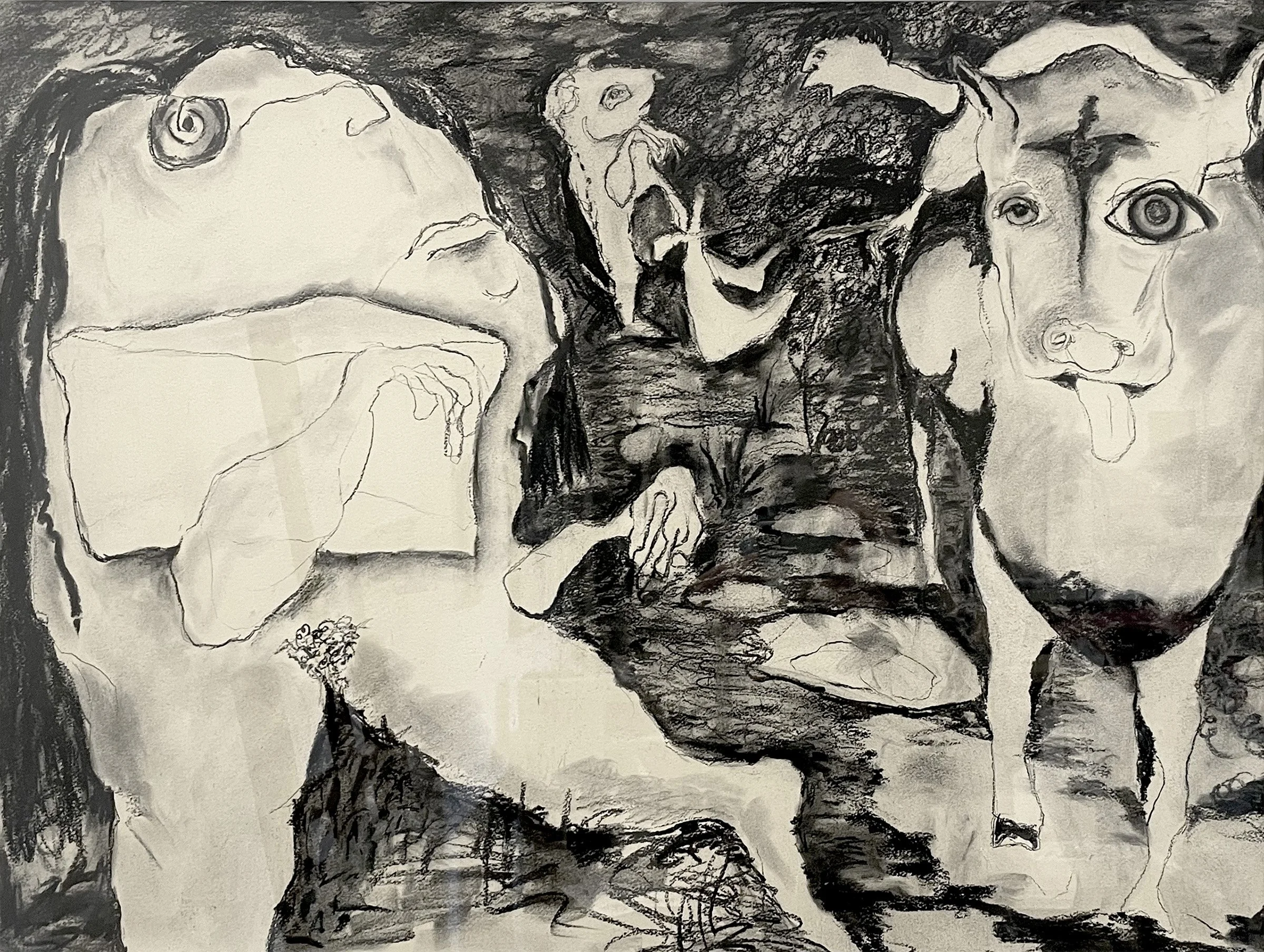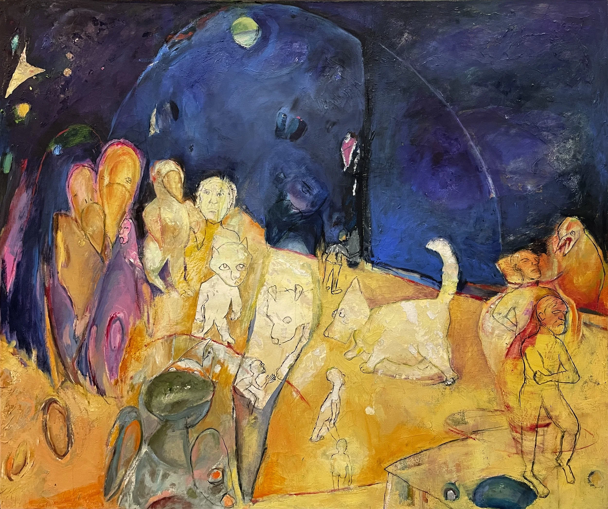 Known for creating surreal, emotionally resonant worlds, Bernstein’s paintings, charcoal drawings, and mixed-media works invite viewers into spaces where playfulness, mystery, hope, despair, connection, and tension coexist. Her process is deeply intuitive, emerging from subconscious exploration rather than formal planning.